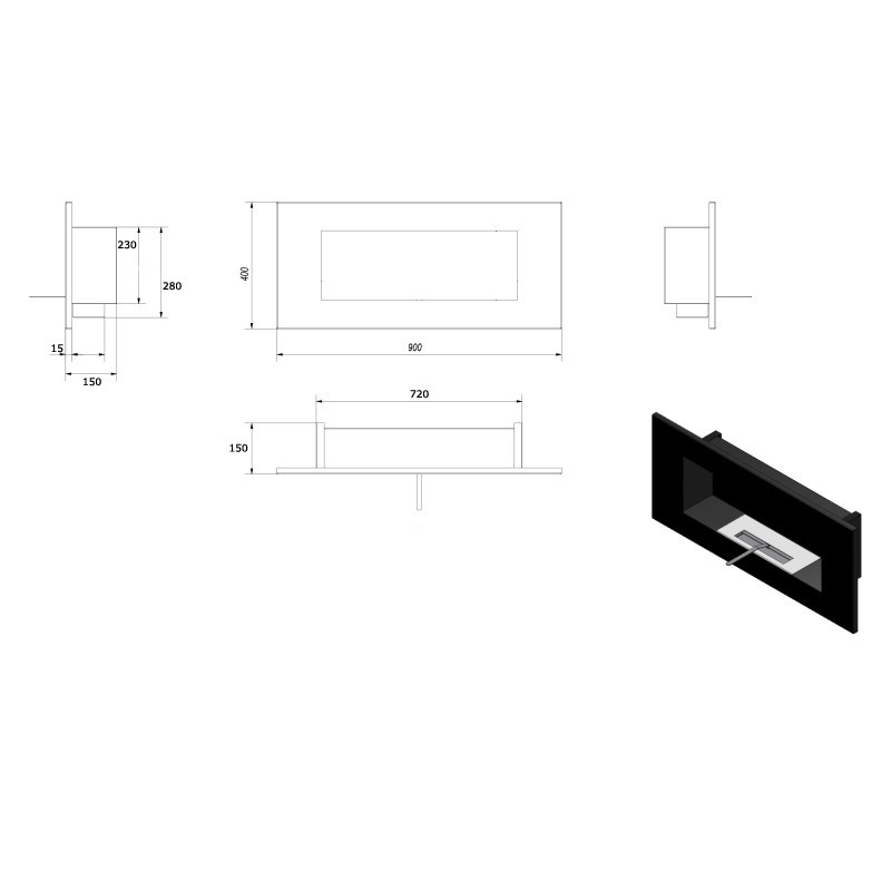 Biocamino da parete o da incasso di medie dimensioni con bruciatore per bioetanolo da 1,5 litri regolabile in acciaio inox. Questo camino è costruito in acciaio con verniciatura a polvere per alte temperature oppure in naturale acciaio inox per ambienti moderni.